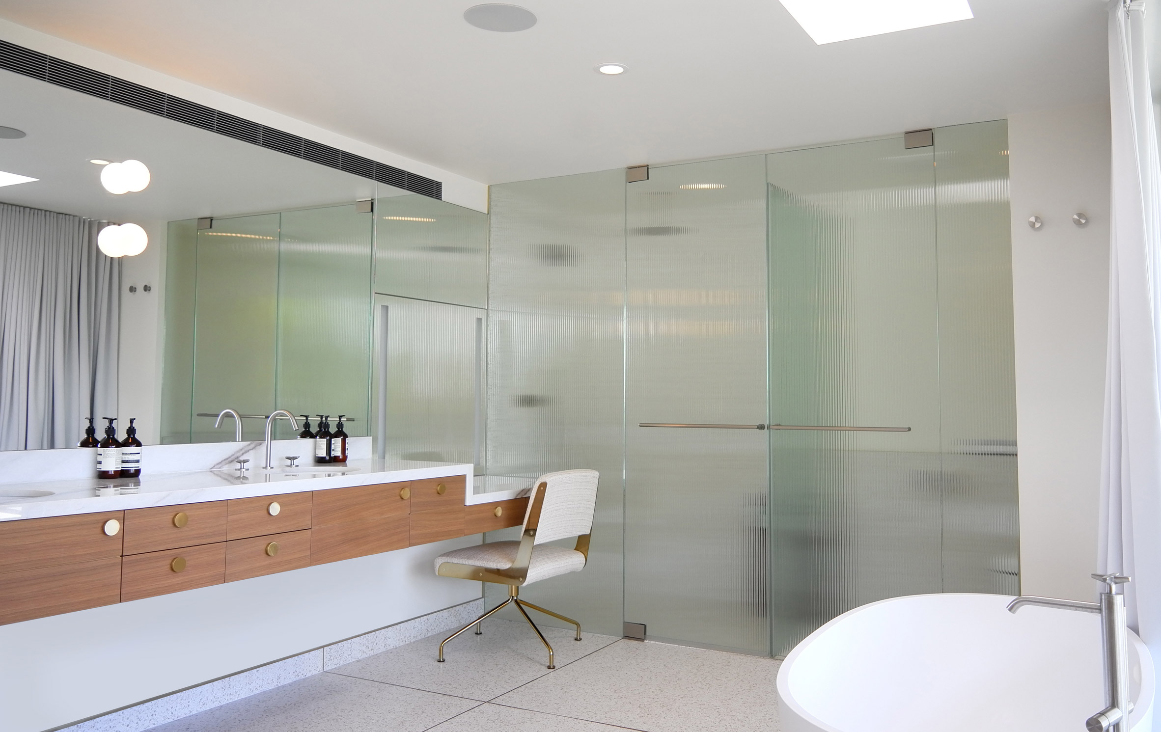 The bathroom also features mid-century modern style designs, such as ribbed-glass shower doors and a wood-panelled sink. Discretely patterned white terrazzo covers the floor.