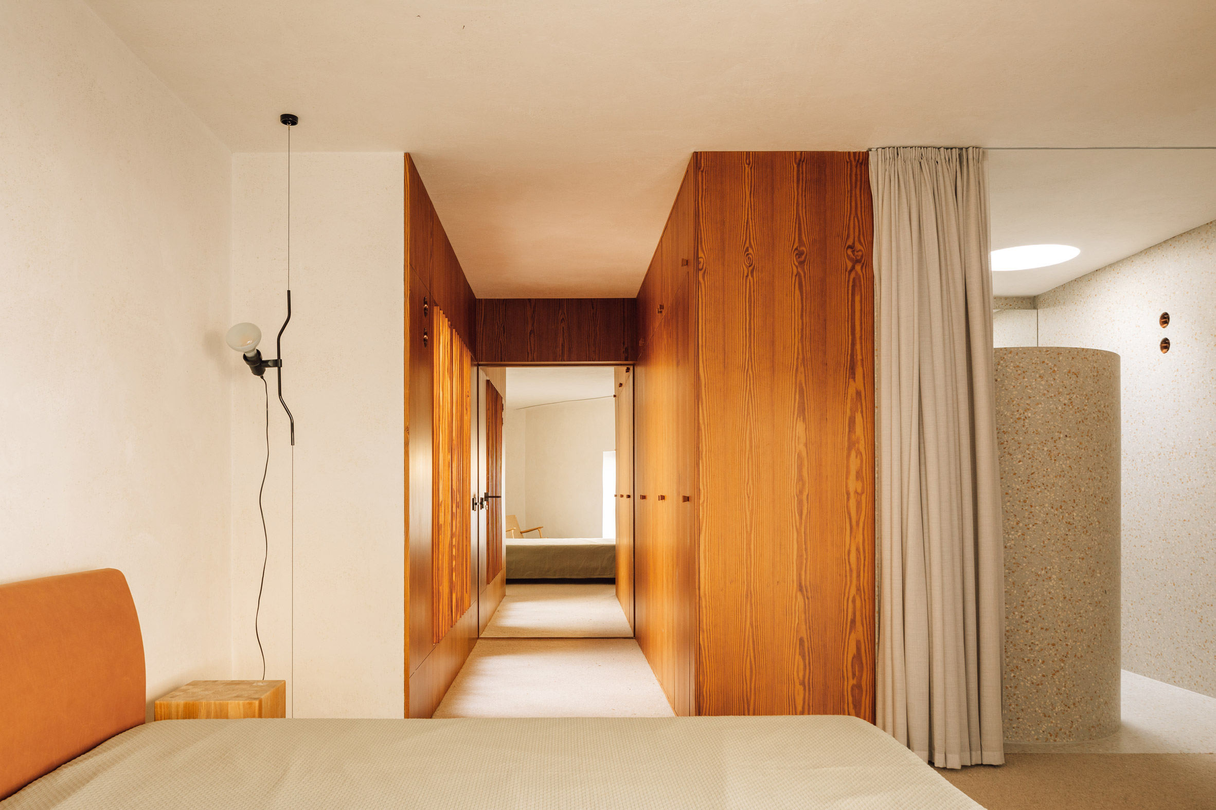 Bak Gordon Arquitectos designed four en-suite bedrooms for the annexe, adding a terrazzo-clad shower cubicle inside one of them. The open-plan bathroom is hidden behind a discreet, oat-coloured curtain.